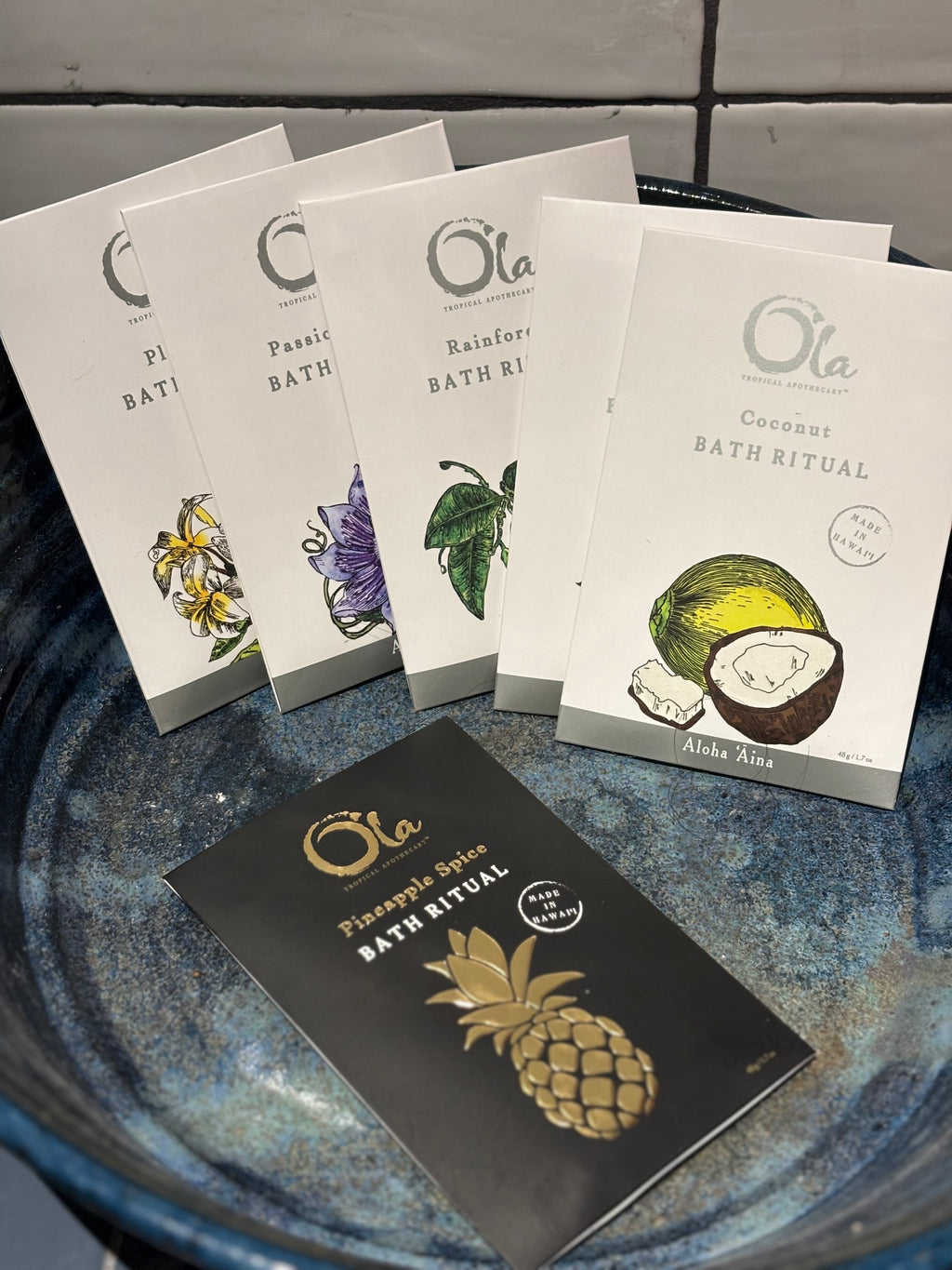 オラ バス リチュアルは、純粋なハワイの海塩、粗糖、ココナッツ ミルク、オーガニック ココナッツ オイル、ジンジャー、バンブー、タロイモの抽出物をブレンドした保湿効果のある治療効果のあるトリートメントです。肌を浄化して栄養を与え、心をリラックスさせ、筋肉痛を和らげるために配合されています。ほんのり香る。